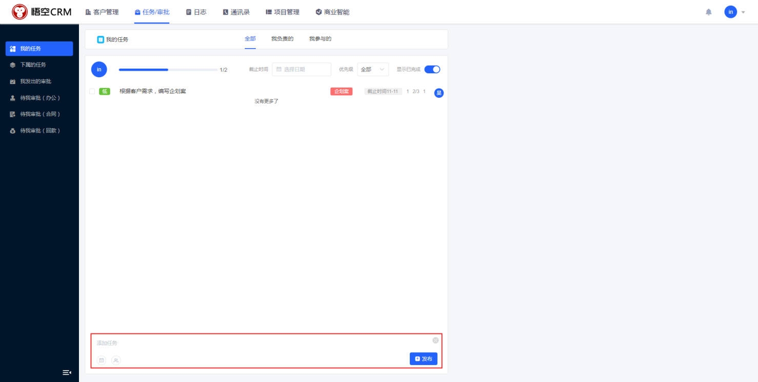 点击CRM「任务/审批」功能模块,进入我的任务,查看与用户有关联的全部任务、我负责的任务、我参与的任务。