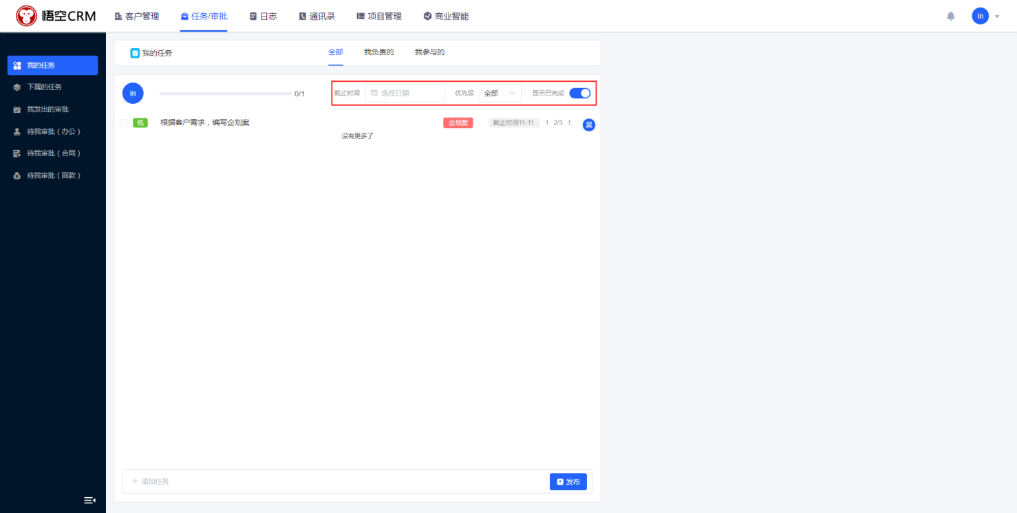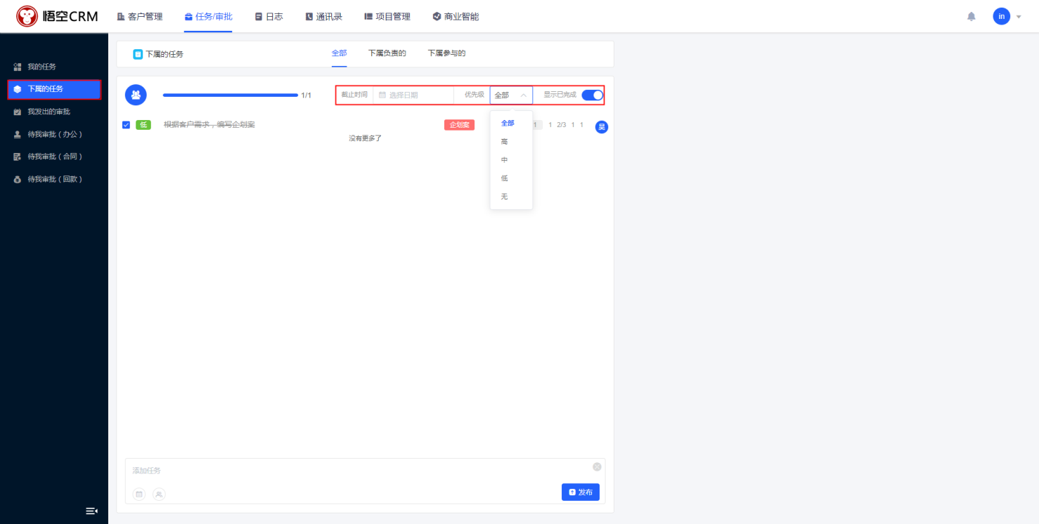 用户可在CRM下属的任务列表根据截至日期、优先级、完成状态查找相对应下属的任务信息。