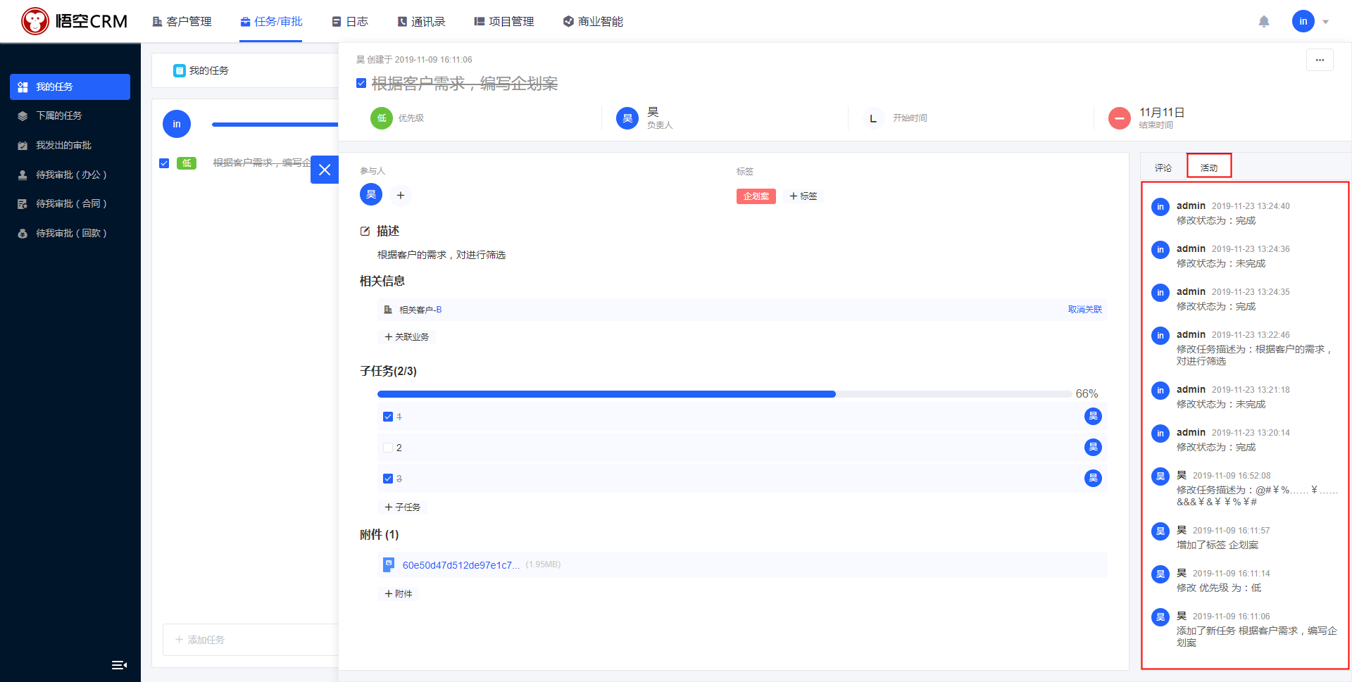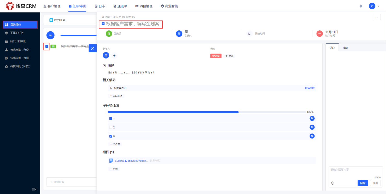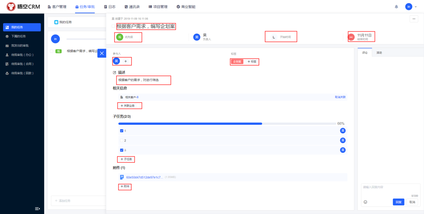 在CRM的任务列表中,点击任务名称,可以查看到任务详情信息。在任务详情中可以对任务添加参与人、添加任务优先级、添加描述、关联相关业务数据、添加子任务、添加附件、任务标签。