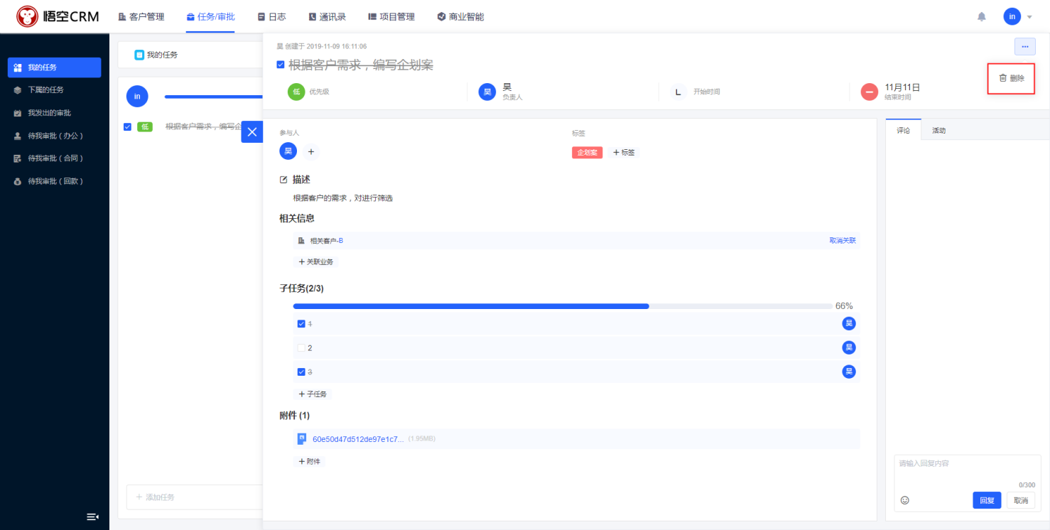 在CRM的任务列表中,点击任务名称,可以查看到任务详情信息。点击右上角更多功能可对任务进行删除操作。
