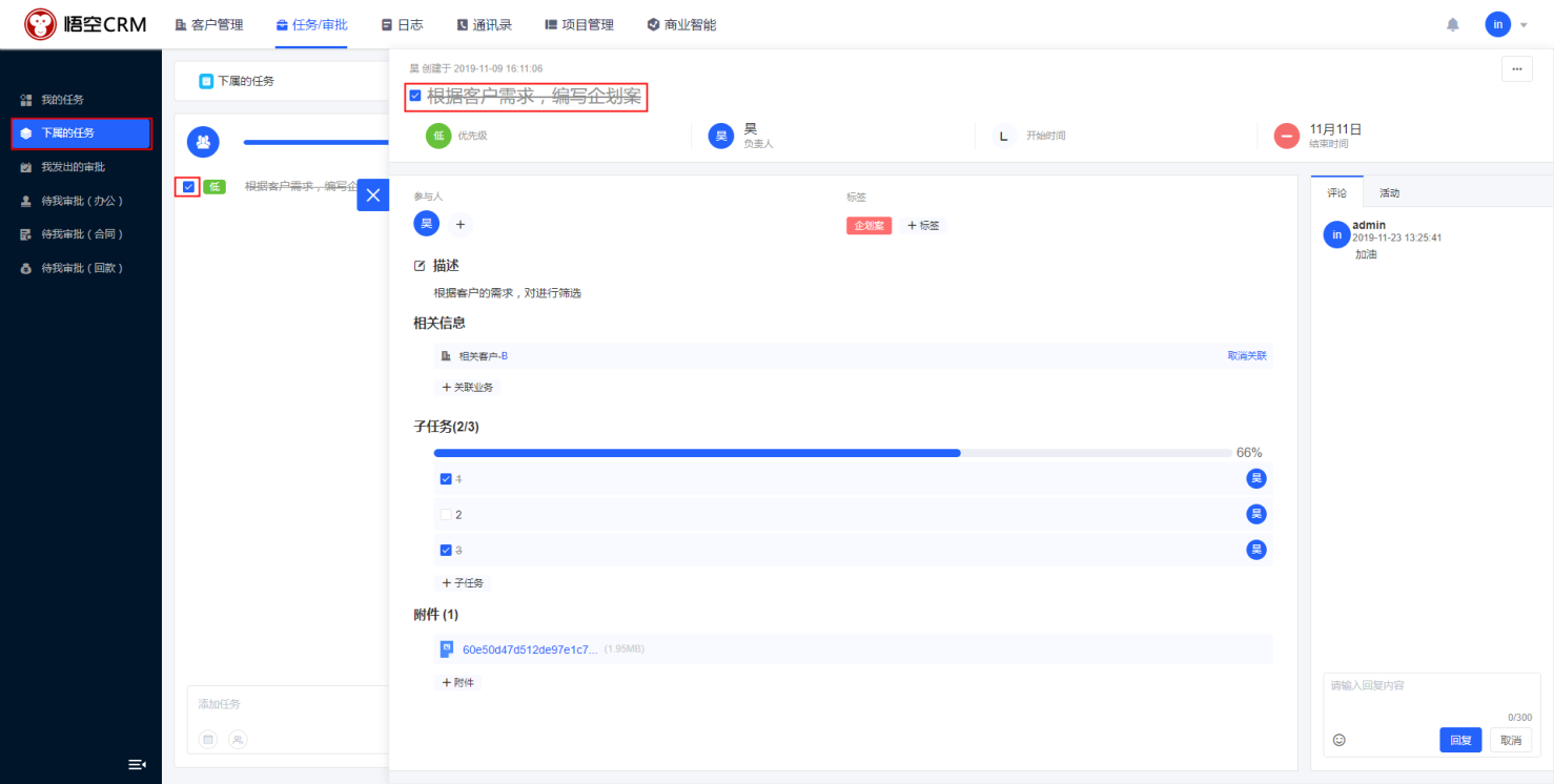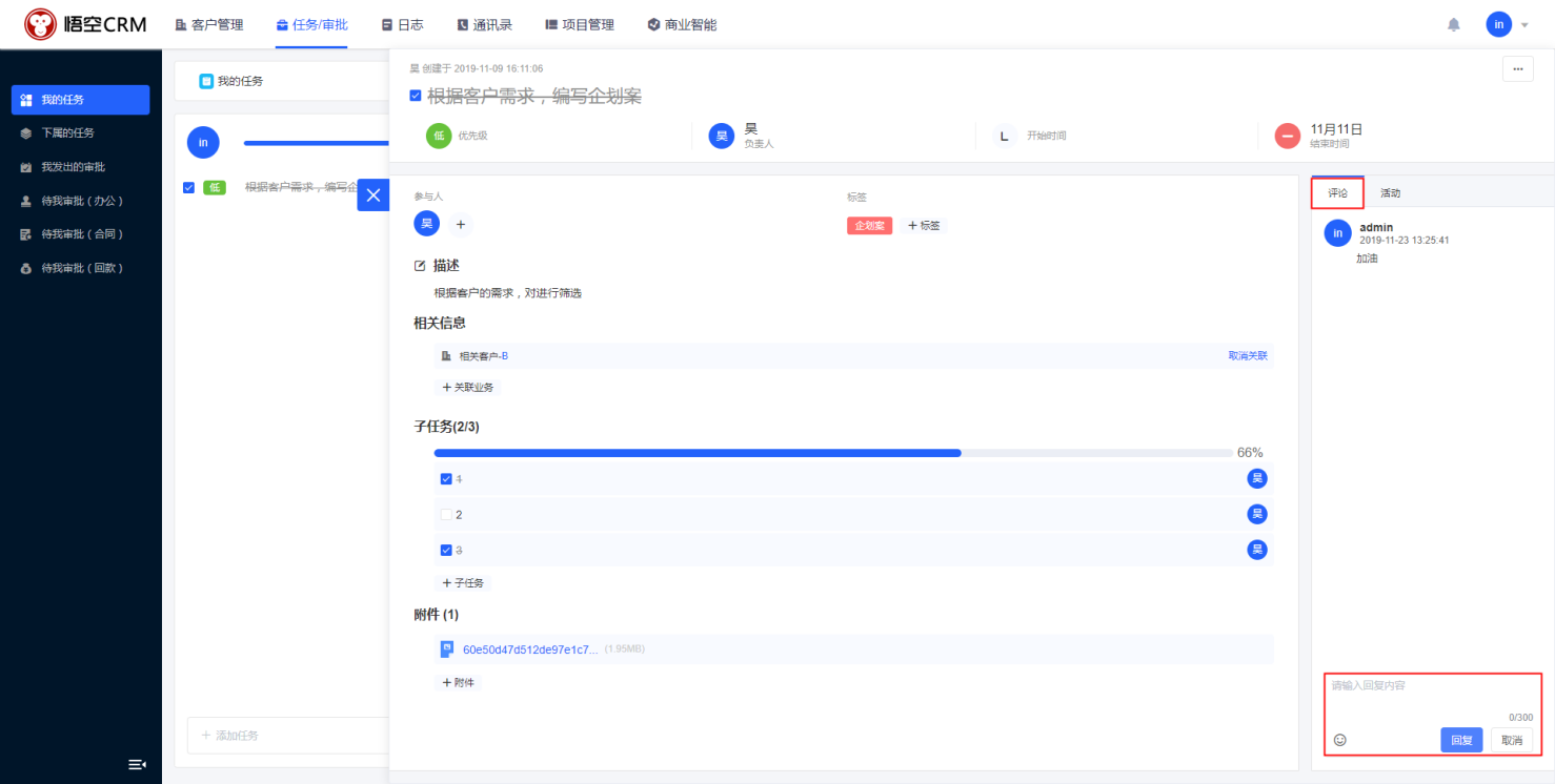 在CRM中,参与人可以对任务进行回复,及时的回复任务进度及任务完成情况,高效的进行任务协同办公。