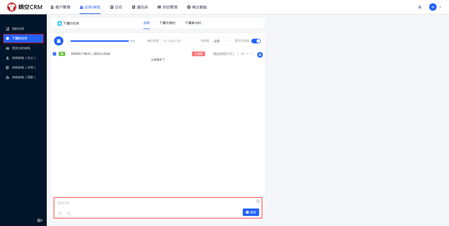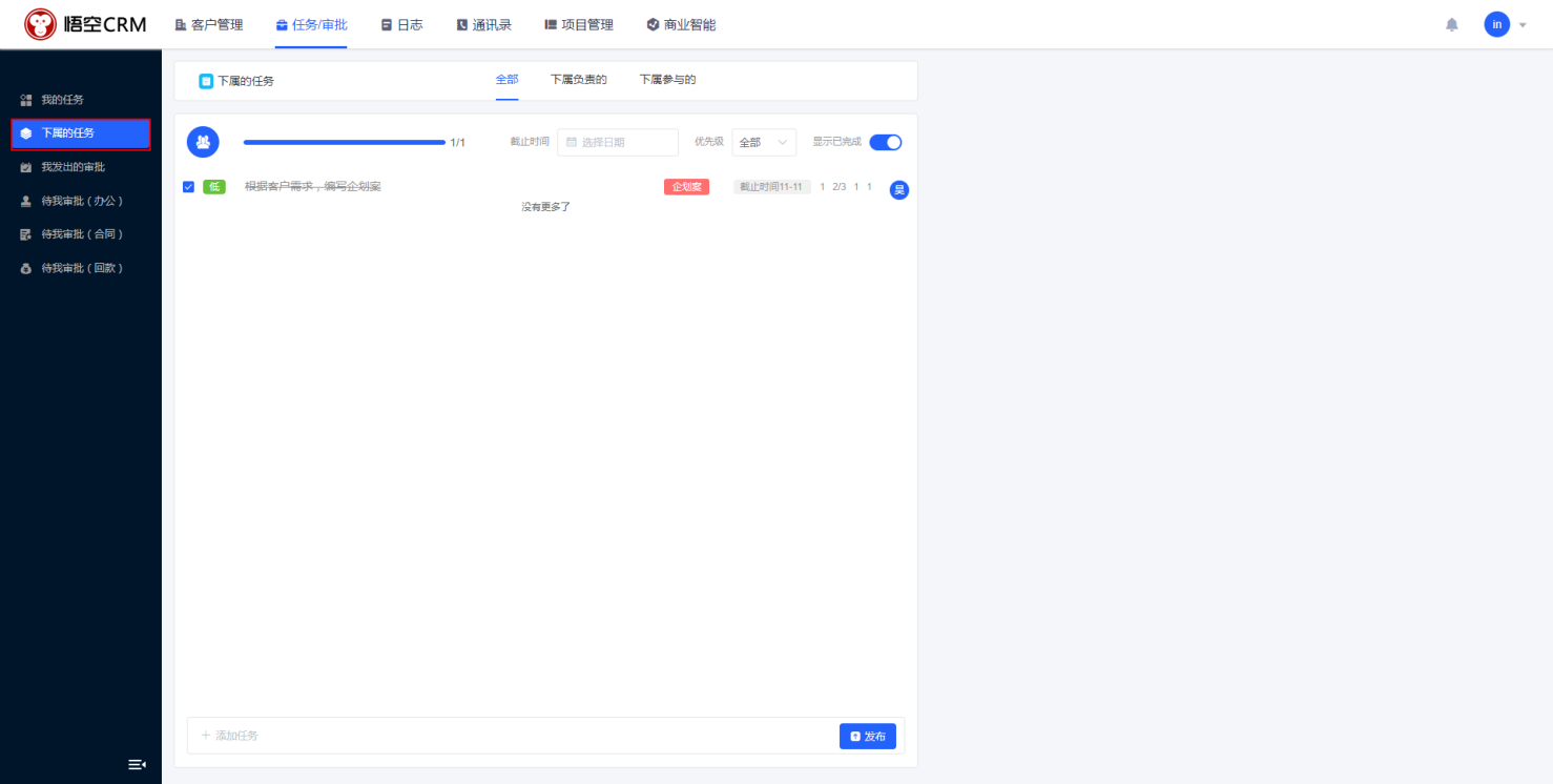 在CRM的「任务/审批」模块中,点击下属的任务,查看与用户下属有关联的全部任务、下属负责的任务、下属参与的任务。