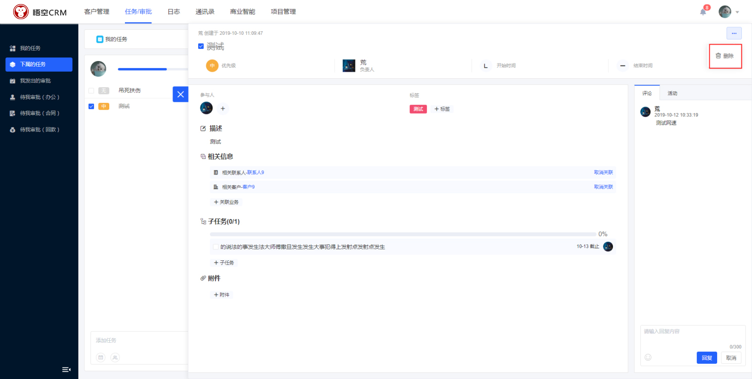 在CRM下属的任务列表中点击任务名称,可以查看到任务详情信息。点击右上角更多功能可对任务进行删除操作。