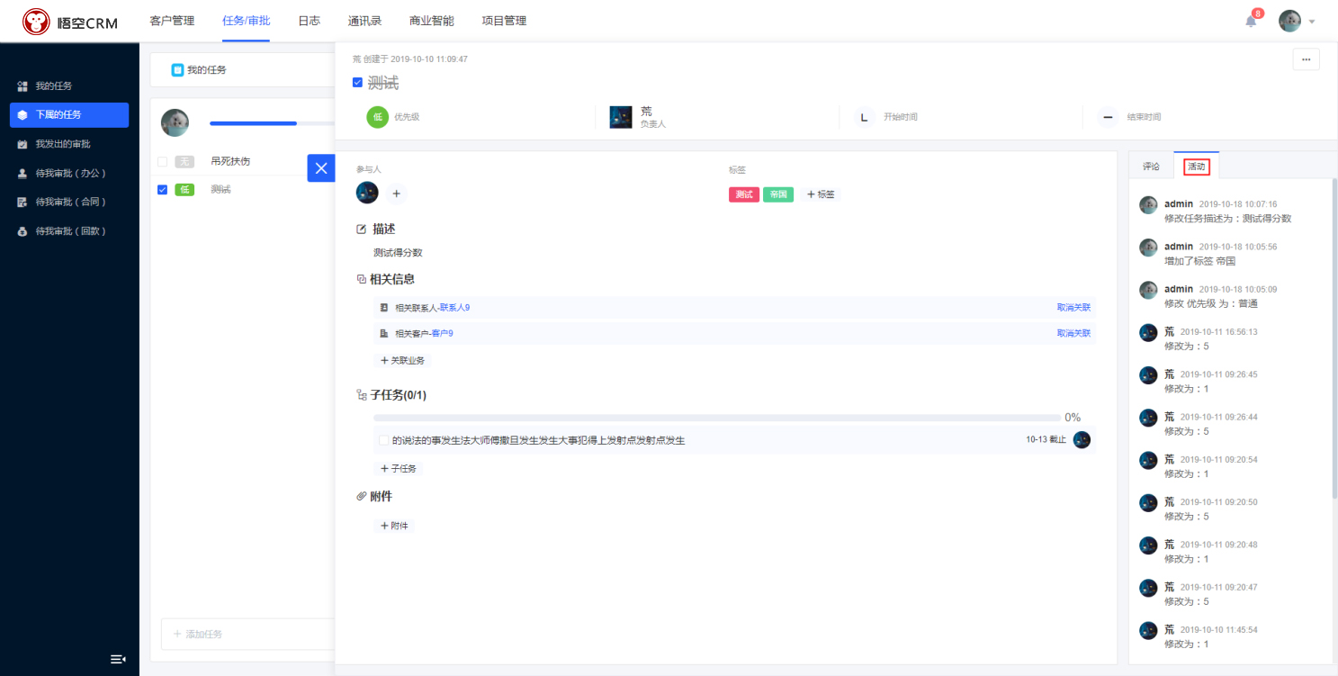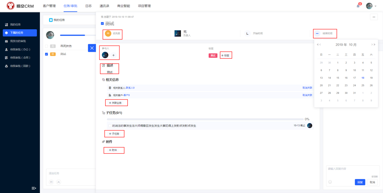 在CRM下属的任务列表中点击任务名称,可以查看到任务详情信息。在任务详情中可以对任务添加参与人、添加任务优先级、添加描述、关联相关业务数据、添加子任务、添加附件、任务标签。