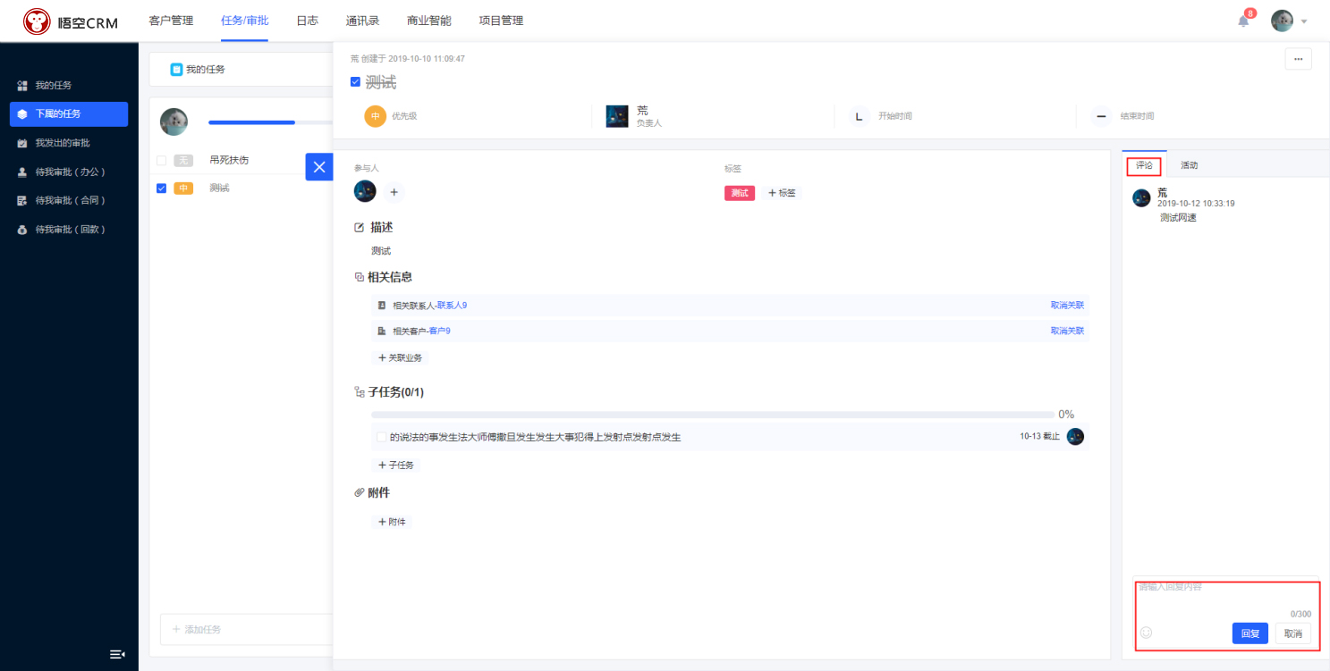 在CRM下属的任务中,参与人可以对任务进行回复,及时的回复任务进度及任务完成情况,高效的进行任务协同办公。