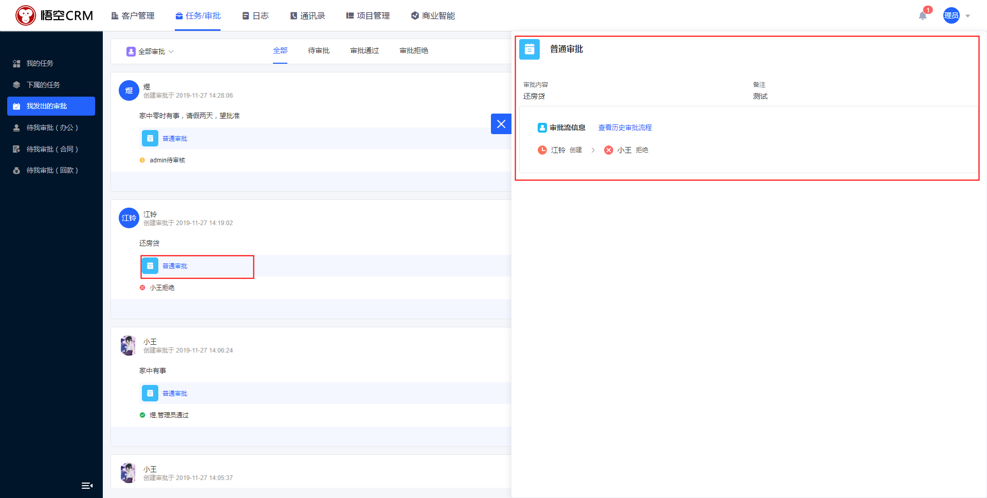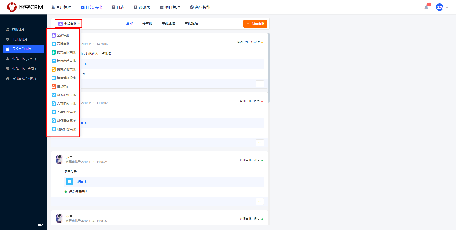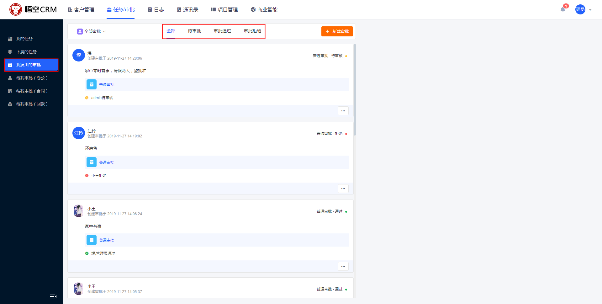 在CRM「任务/审批」功能模块中,点击我发出的审批,查看与用户有关联的全部、待审批、审批通过、审批拒绝的办公审批。