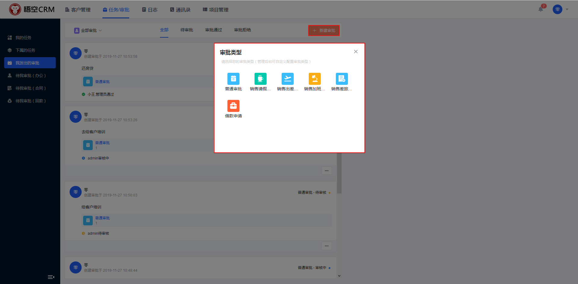 CRM系统的办公流程审批包含:普通审批、请假审批、出差审批、加班审批、差旅报销、借款申请以及自定义的办公审批。(管理后台可自定义配置审批类型)