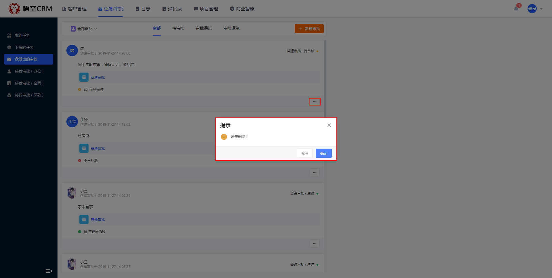 用户可在CRM审批列表对发出的办公审批进行删除。点击需要删除的审批,在更多功能点击【删除】按钮,可进行删除。(注:删除审批可对已审批的办公审批直接删除,待审批的办公审批需先撤回才能进行删除)