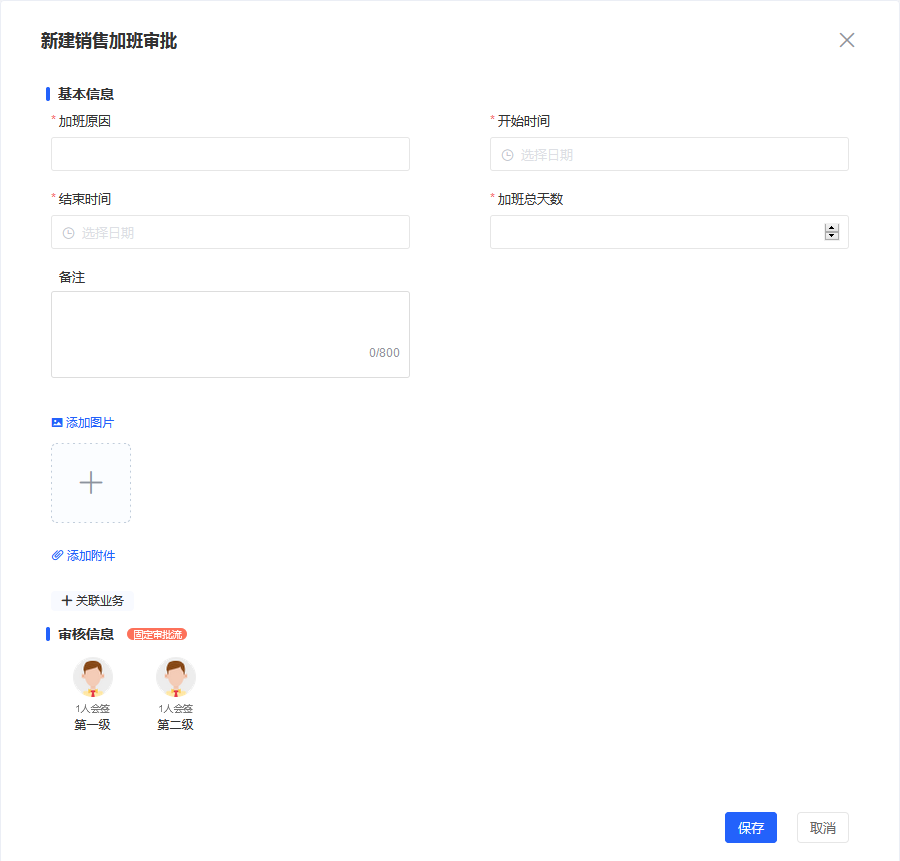 以加班审批为例,选择加班审批,填写具体的审批内容。审批可选择添加图片、添加附件、关联相应的业务。