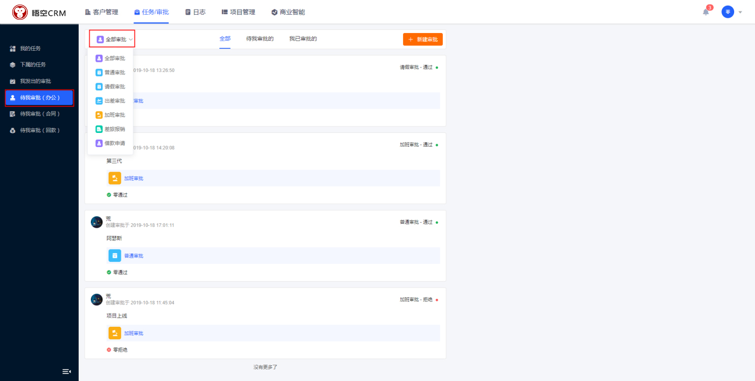 在CRM的「任务/审批」功能模块中,点击待我审批(办公),查看与用户有关联的全部审批、待我审批的、我已审批的办公审批。