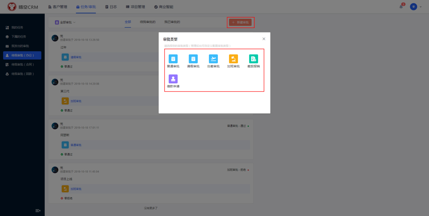 点击「新建审批」,CRM系统会显示所有的审批类型,用户可以根据审批需要,选择具体的审批类型。