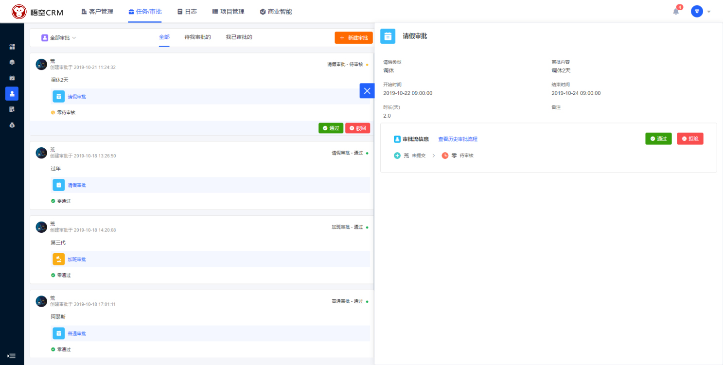 CRM办公流程审批包含:普通审批、请假审批、出差审批、加班审批、差旅报销、借款申请。(管理后台可自定义配置审批类型)