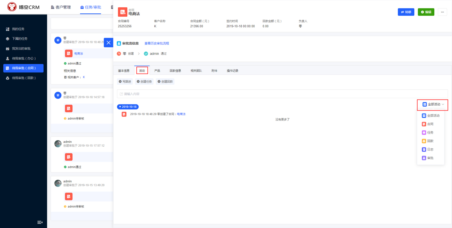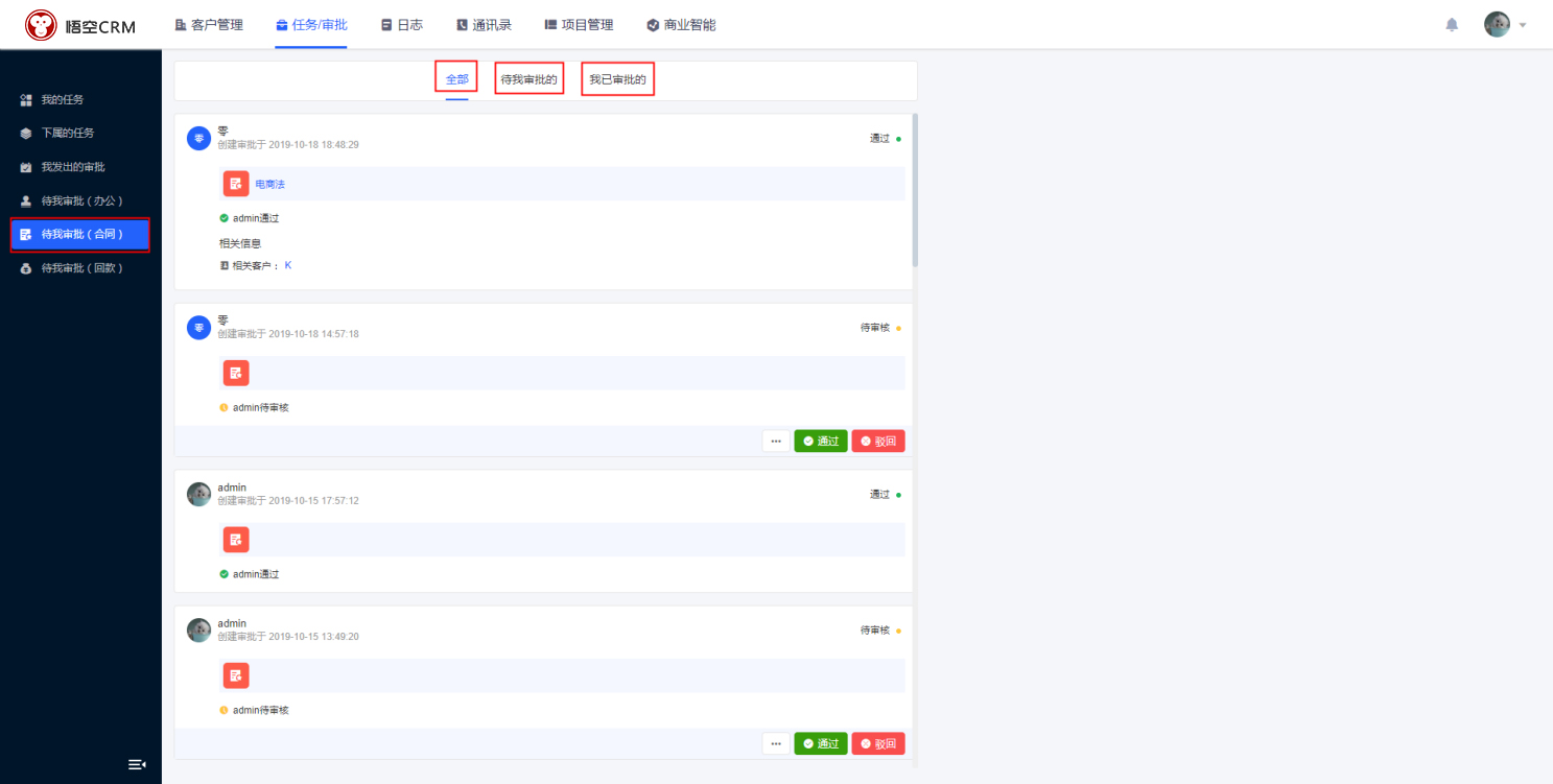 在CRM的「任务/审批」功能模块中,点击待我审批(合同),查看与用户有关联的合同,其包括【全部审批】、【待我审批的】、【已经审批的】的合同审批,合同显示相关信息。可以对待审核合同进行审批。(通过、拒绝、撤回)