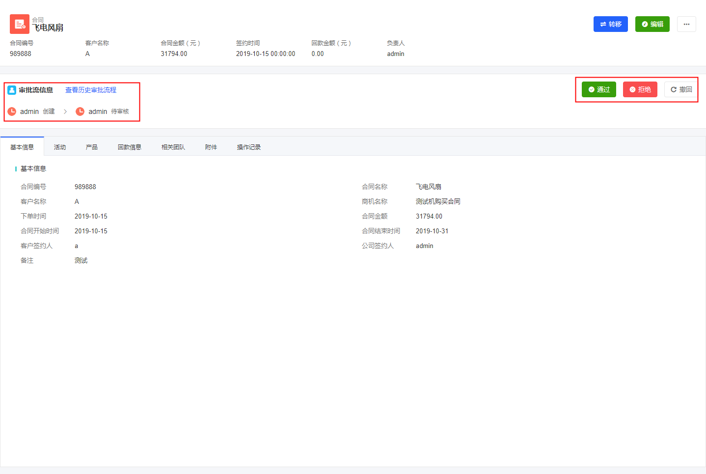 合同审批流:合同添加审批后,在合同详情中会显示合同的审批流程,以及审批的记录,对合同进行审核(通过、拒绝、撤回)。