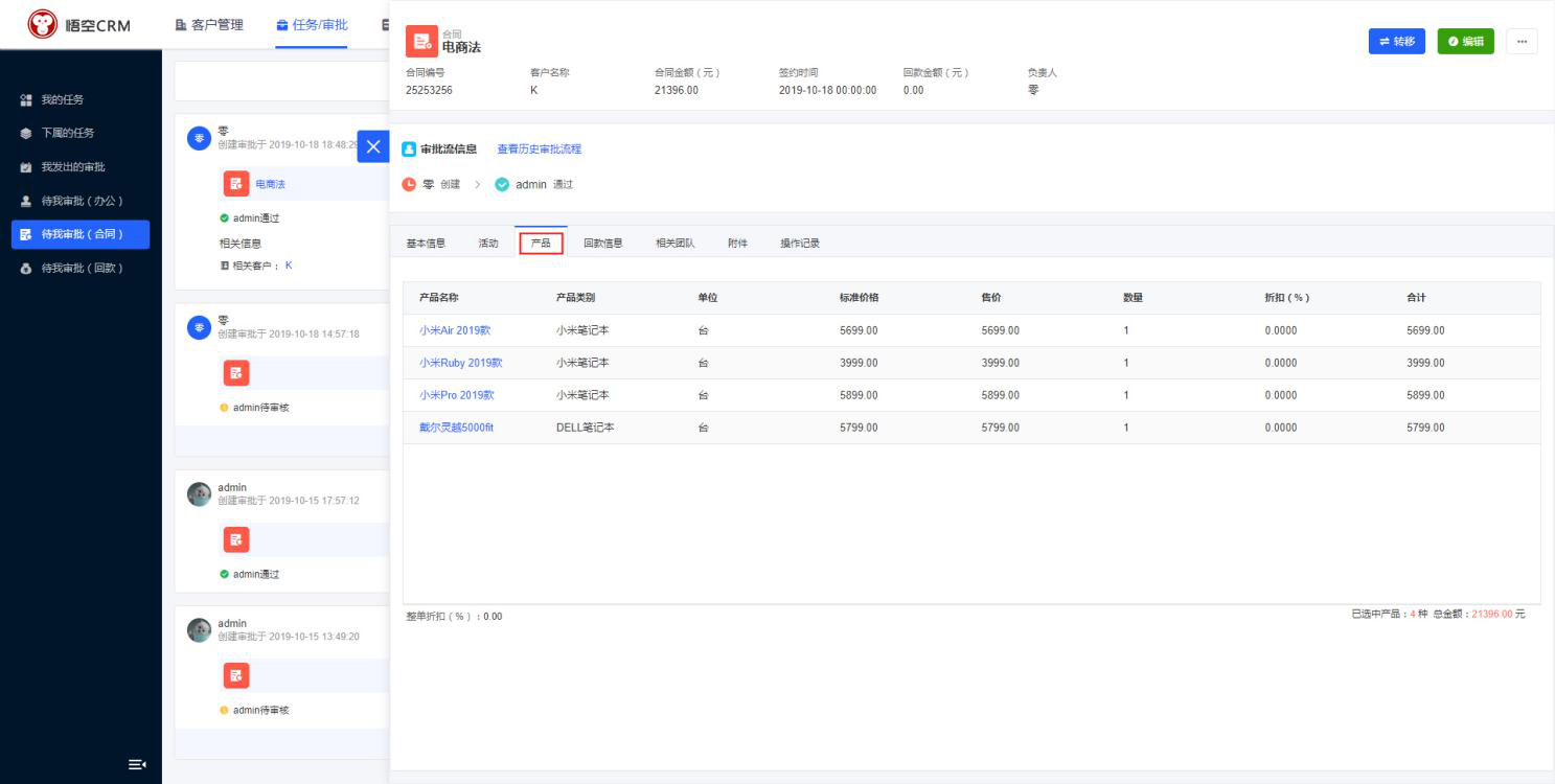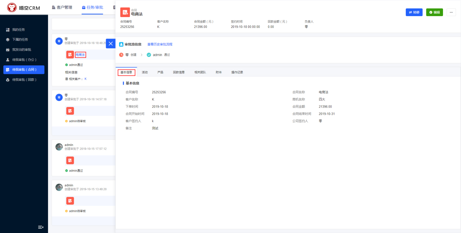 在CRM审批列表,点击合同名称,在合同详情中会显示所有与合同相关的数据。