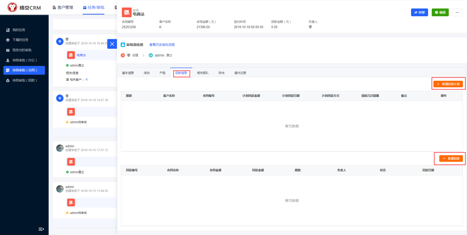 回款信息:回款是合同的重要组成部分,合同审核通过后,可以在合同下添加回款计划和回款信息。(一个回款可关联多个回款计划)