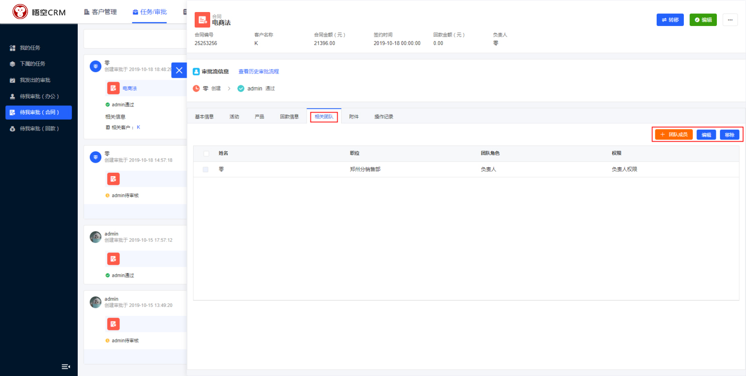 相关团队:合同负责人可以将其他员工加入到合同团队中,合同团队中的成员可以共同的维护合同信息。添加团队成员可以设置团队成员的权限:只读或读写。(可对团队成员进行添加、编辑、删除)
