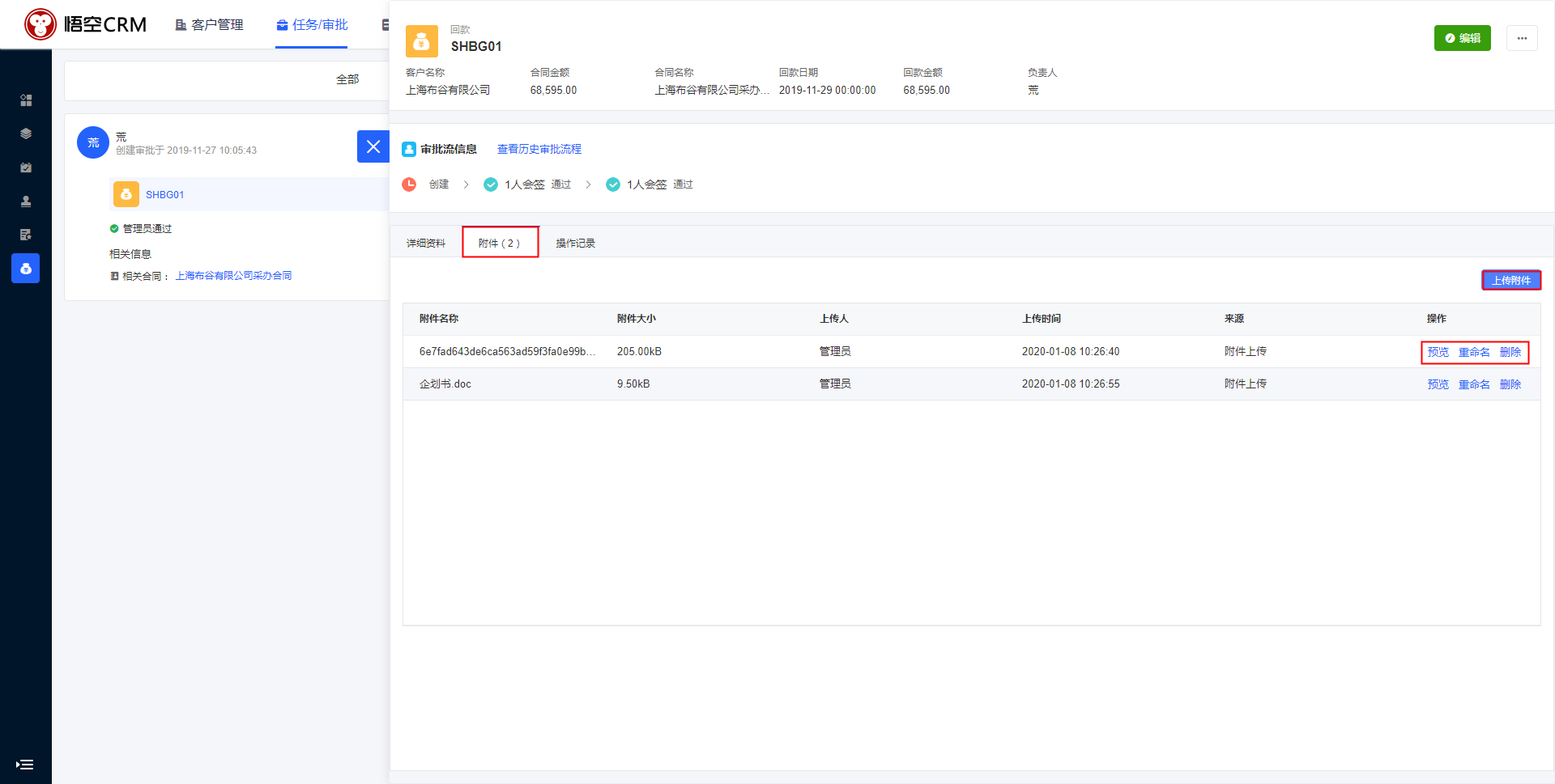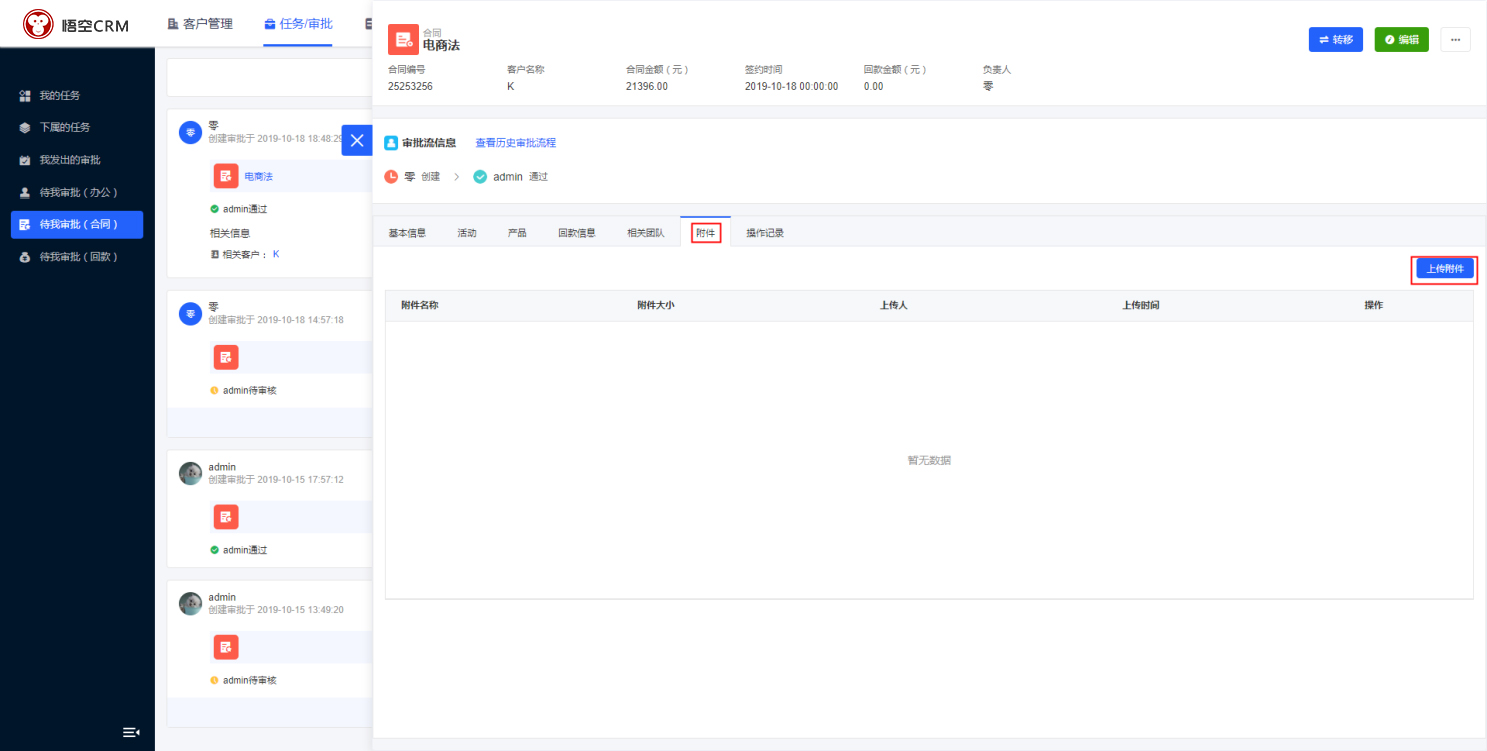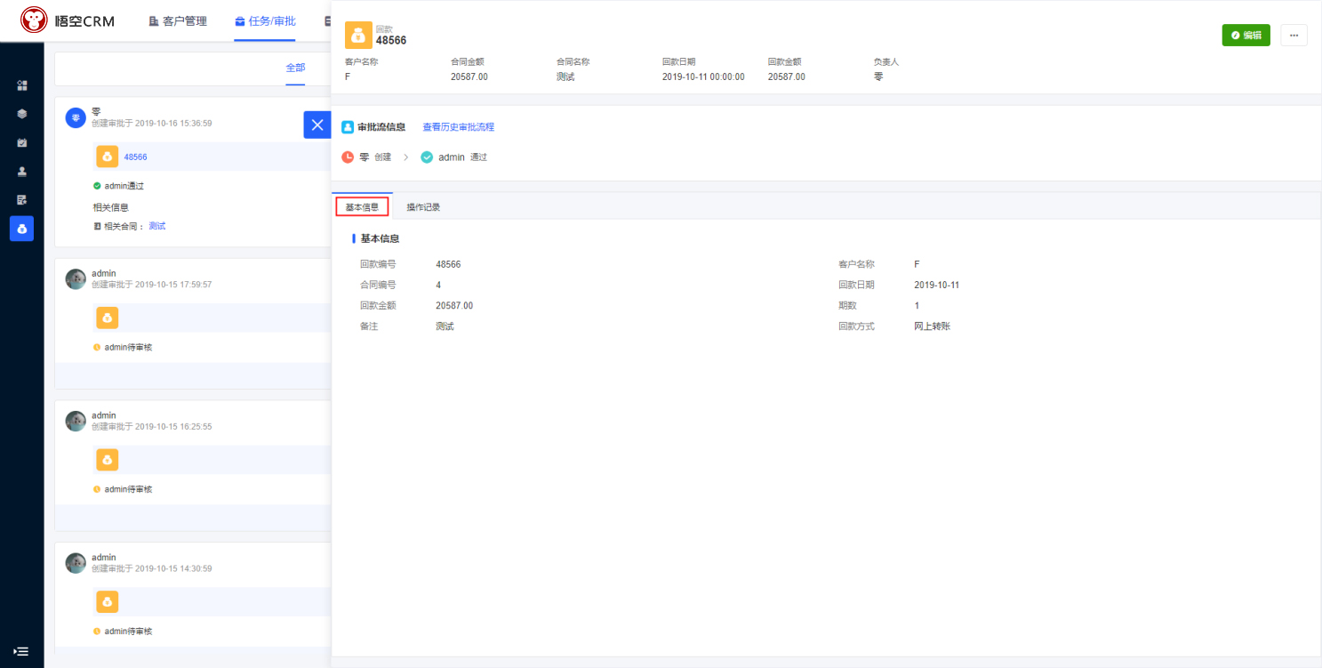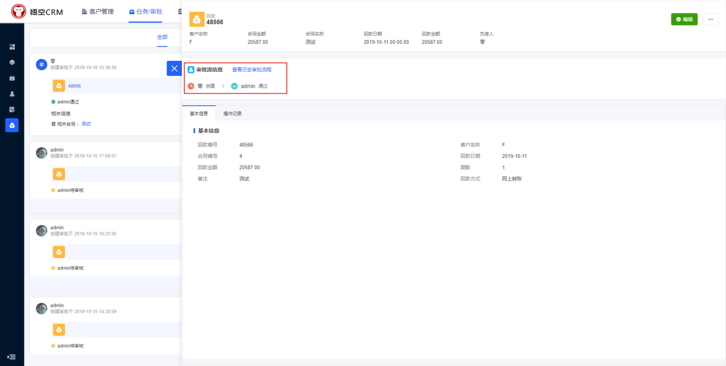 在CRM待我审批(回款)中,点击回款编号,在回款详情中会显示所有与回款相关的数据。