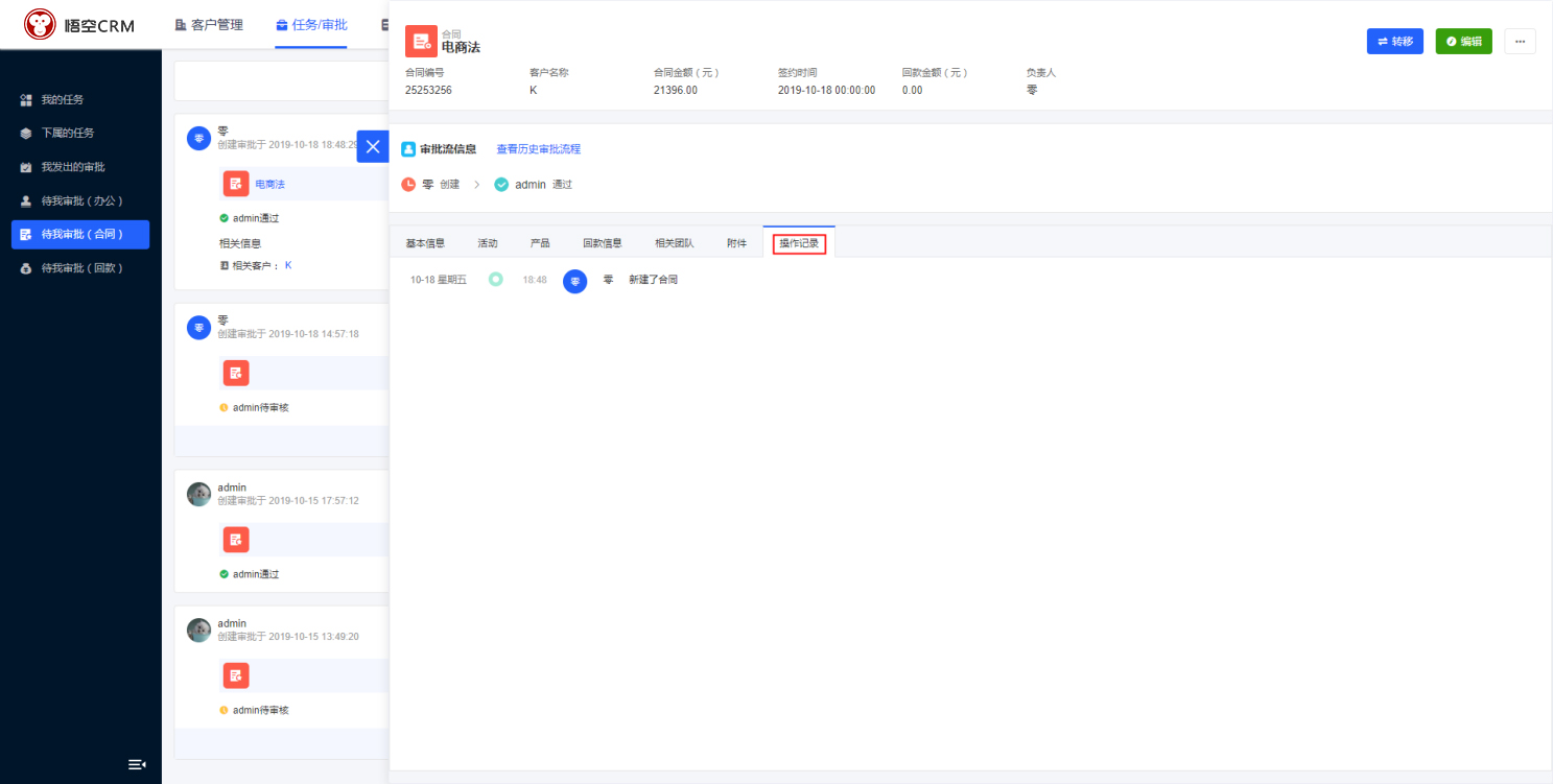 操作记录:CRM的合同操作记录显示的是添加、编辑、删除等相关操作记录,包活字段的编辑记录。