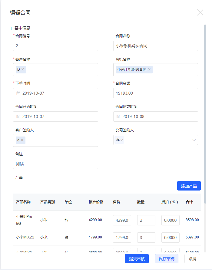 产品:在CRM中,合同创建过程中可以关联产品信息,与合同相关的产品信息将会在合同产品中展示。