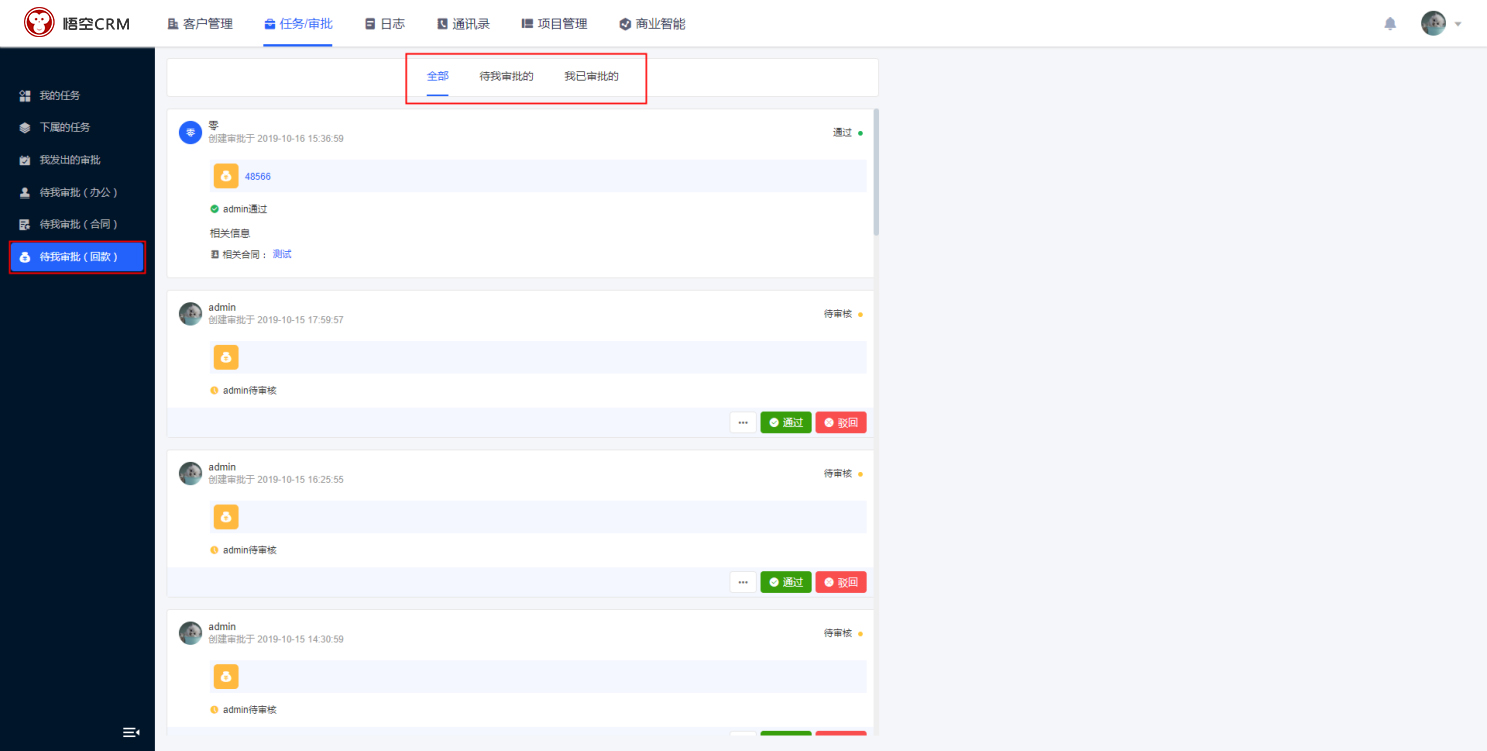 在CRM「任务/审批」功能模块中,点击待我审批(回款),查看与用户有关联的回款,其包括【全部审批】、【待我审批的】、【已经审批的】的回款审批,回款显示相关信息。可以对待审核回款进行审批。(通过、拒绝、撤回)