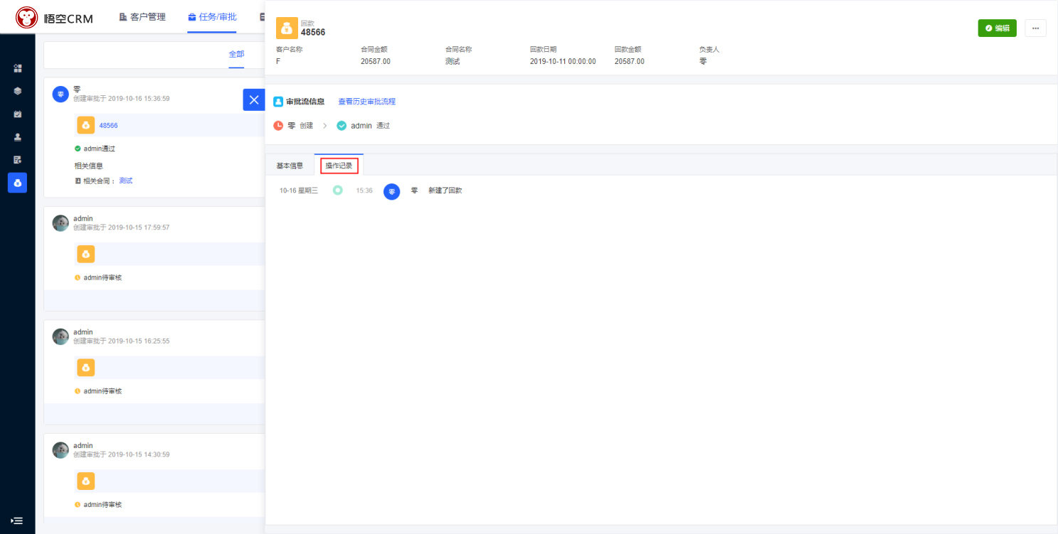 回款审批流:回款添加审批后,在CRM回款详情中会显示回款的审批流程,以及审批的记录。回款审批流在后台进行配置。(通过、拒绝、撤回)