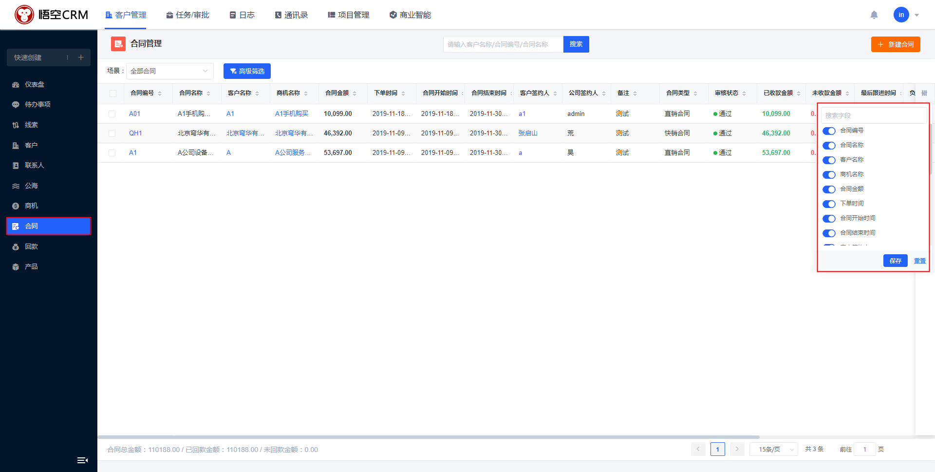 在CRM的合同列表中,将显示所有合同的字段信息。用户可以在右侧点击配置按钮,自定义配置客户显示的字段及字段的顺序。