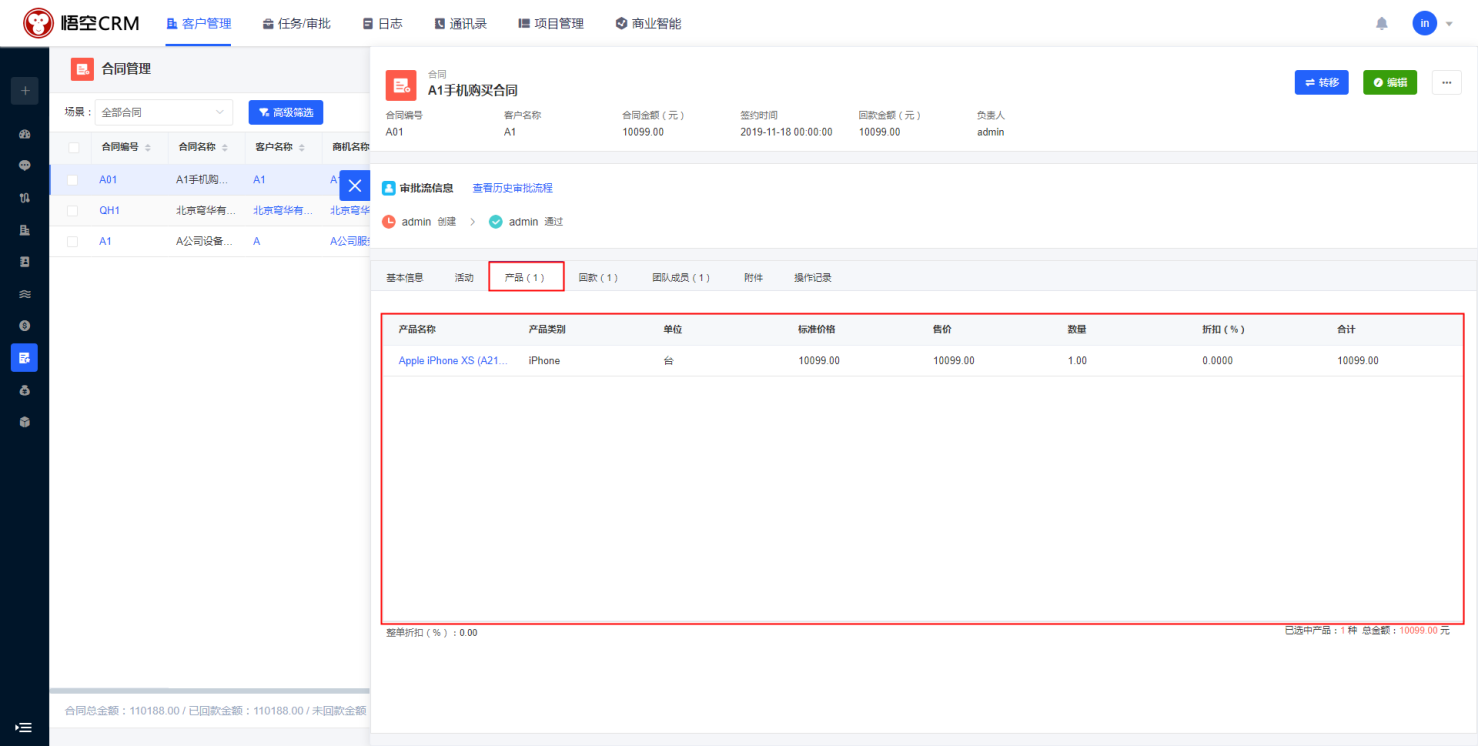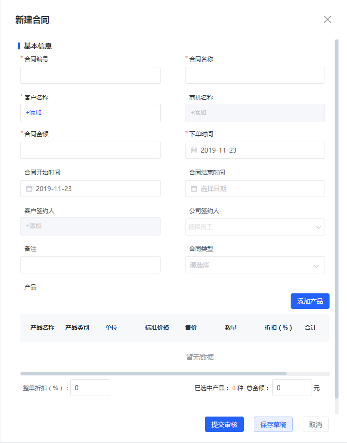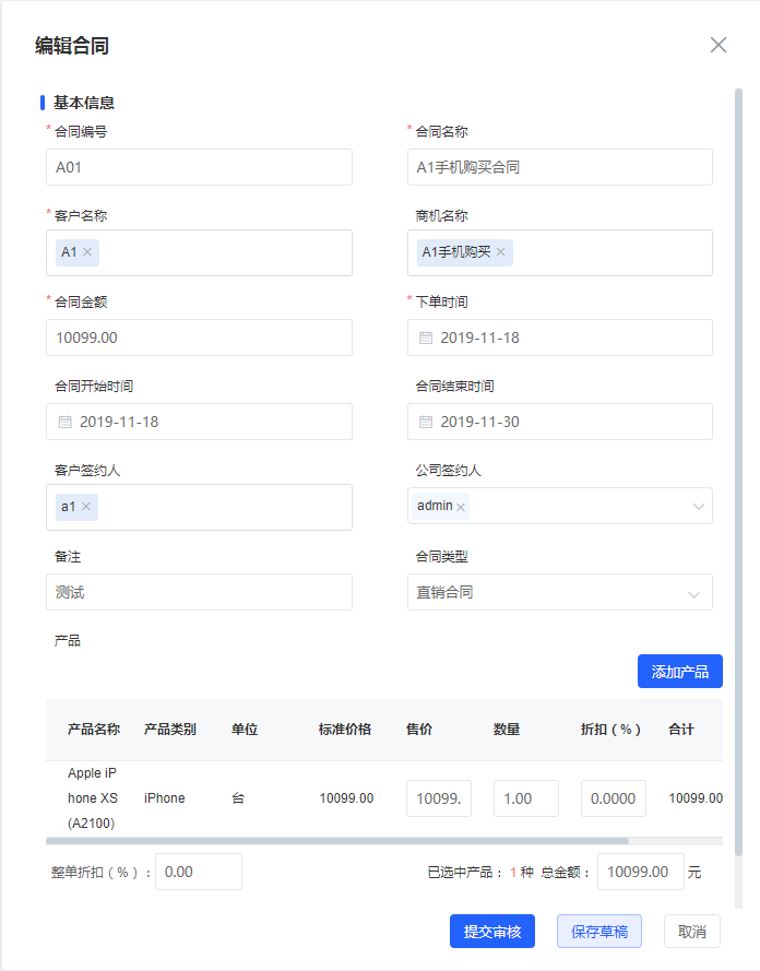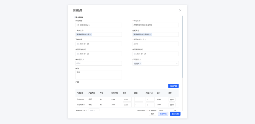 产品:合同创建过程中可以关联产品信息,与合同相关的产品信息将会在合同产品中展示
