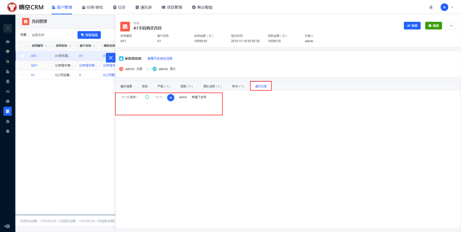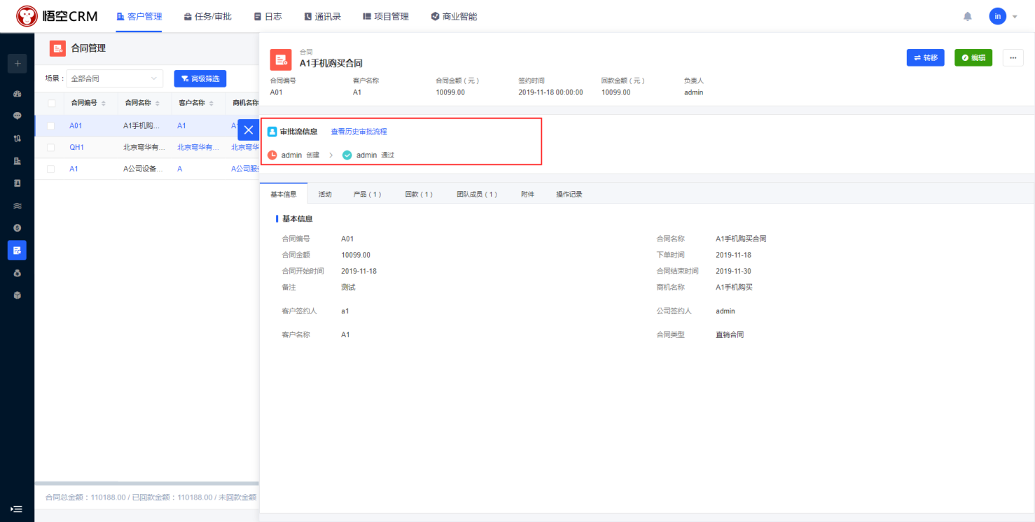 合同审批流:合同添加审批后,在合同详情中会显示合同的审批流程,以及审批的记录,对合同进行审核(通过、拒绝、撤回)。