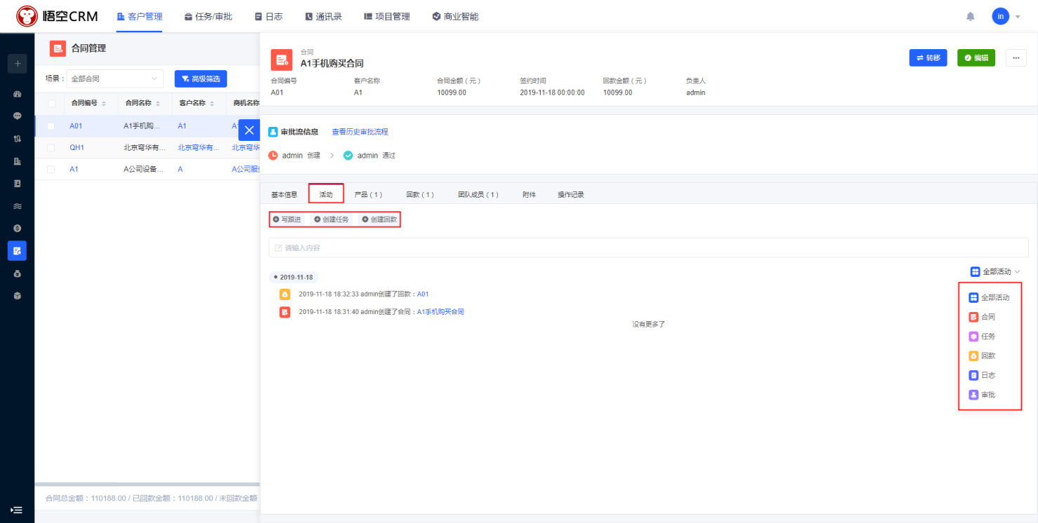 活动:在合同详情中,员工可以随时添加与此合同的所有活动记录。活动记录支持选择写跟进,跟进记录支持选择不同的跟进方式(电话、邮件、上门拜访、短信、活动等)。 员工可以根据沟通的情况,设置下次联系时间并添加到自己的日程当中。还可以创建任务、回款等活动记录。下方还可以根据活动状态查看相应的活动记录