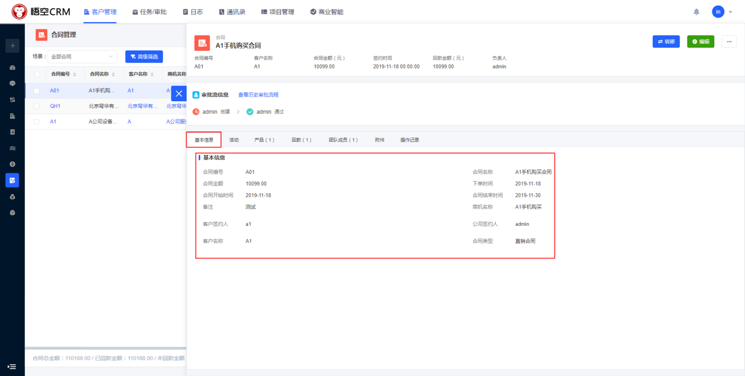 基本信息:CRM合同基本信息,显示的为合同添加过程中的所有字段信息。包含:系统默认字段和自定义字段