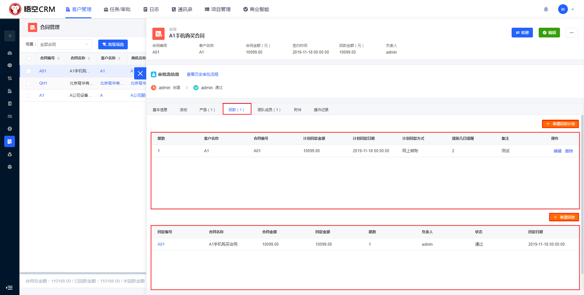 回款:回款是合同的重要组成部分,合同审核通过后,可以在合同下添加回款计划和回款信息。(一个回款可关联多个回款计划)