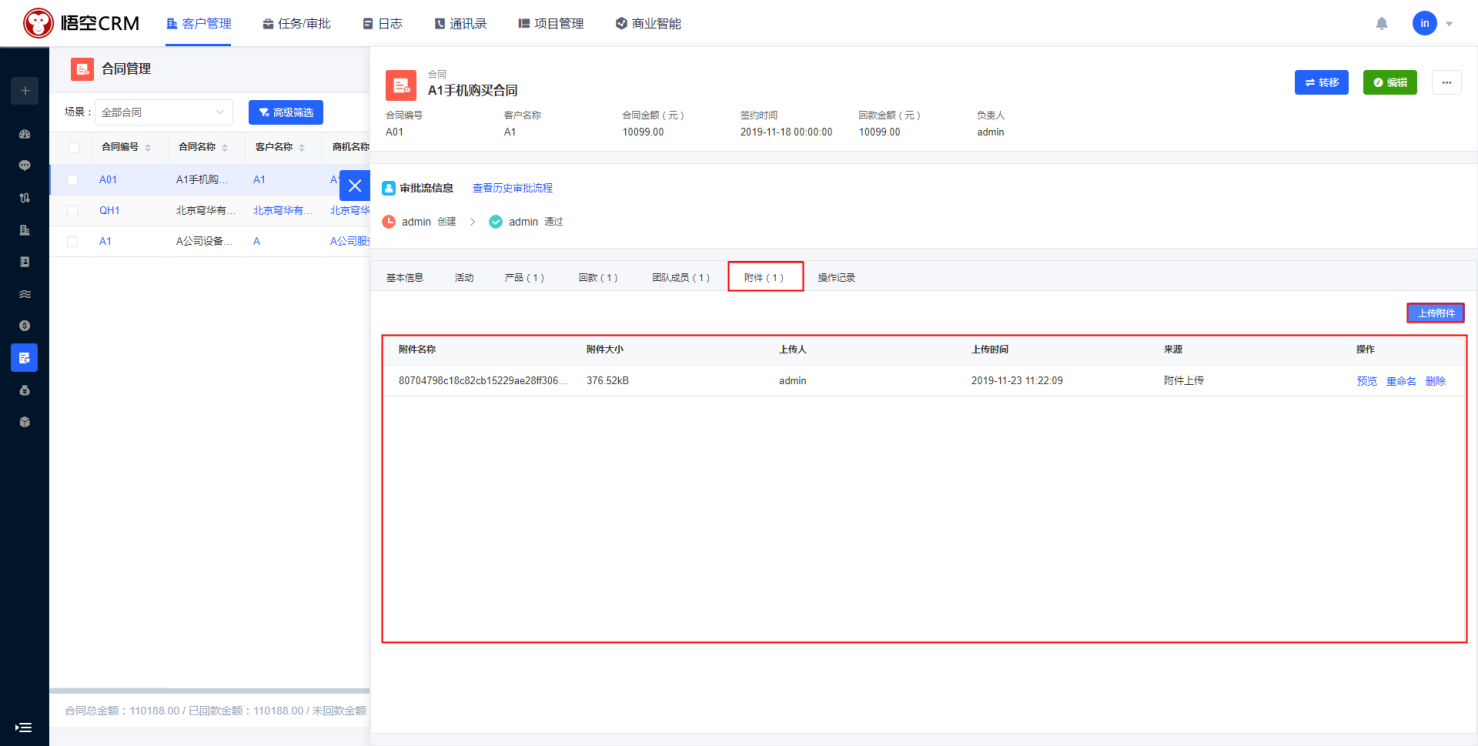 附件:员工可以在合同下添加附件信息,可对附件进行预览、重命名、删除等操作。比如:报价单、合同扫描件(可对附件在线预览、重命名、删除)