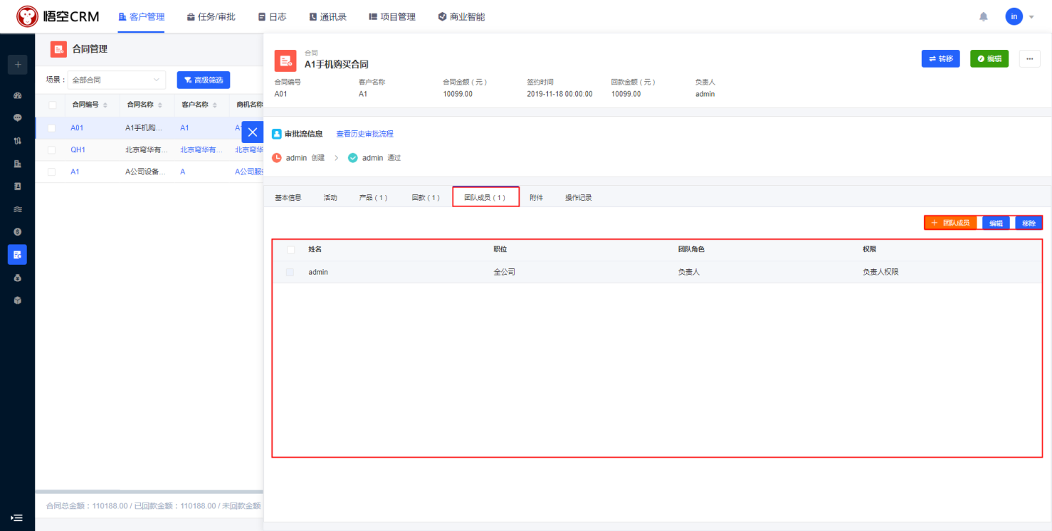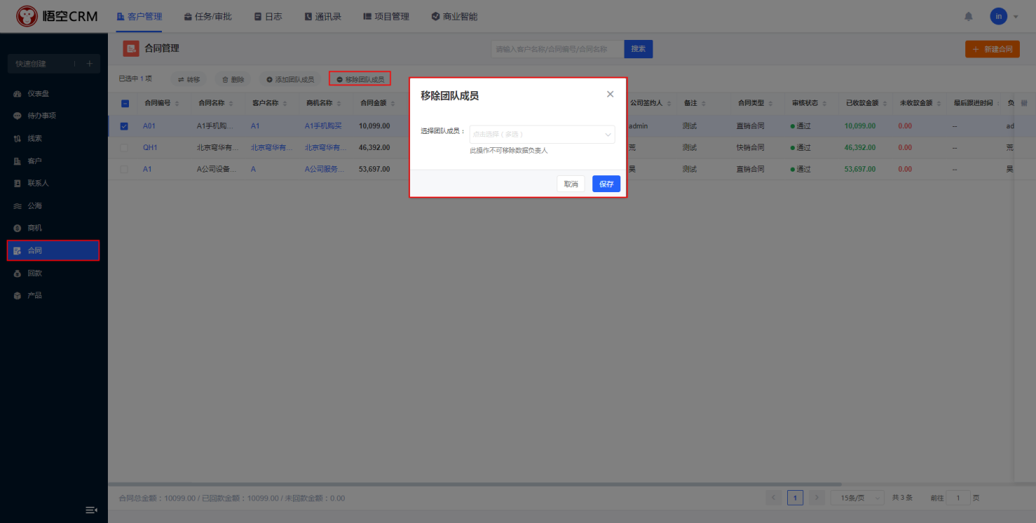 合同负责人可以将团队成员从商机团队中移除,被移除的团队中的成员则无法查看合同信息。