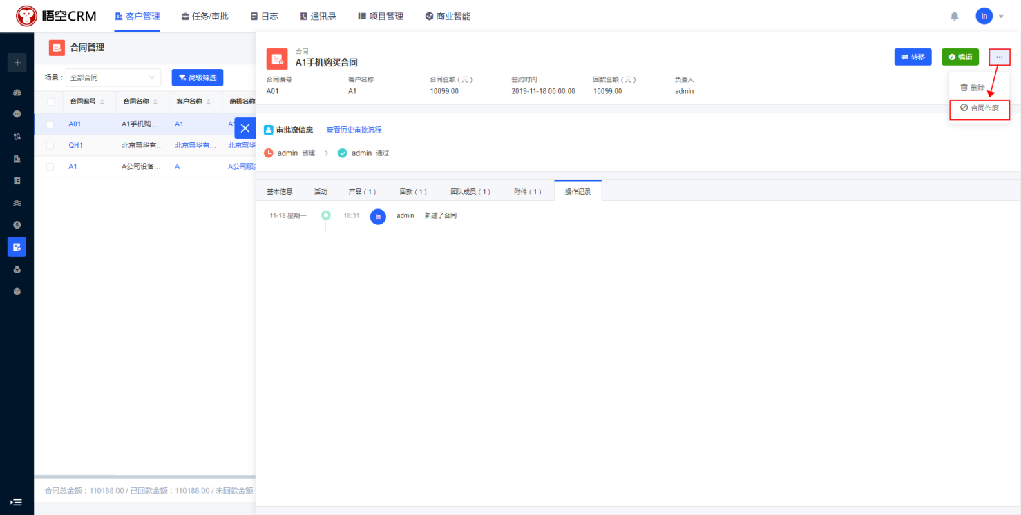 1、单个删除:选择合同打开详情,系统右上角「更多」按钮,则会出现删除按钮,点击「删除」则系统会删除该合同。(删除合同注意:合同下有回款,需先删除回款)