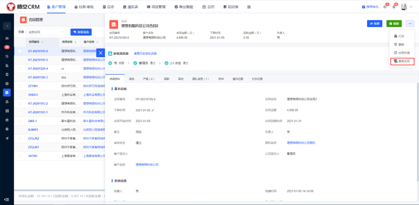 复制合同:用户可对合同进行复制 ,点击复制自动跳转新建合同页面,合同信息与复制的合同相同且可编辑,保存或提交后存为新合同。