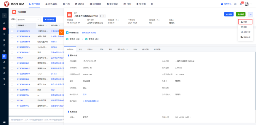点击合同名称,在CRM合同详情中会显示所有与合同相关的数据。