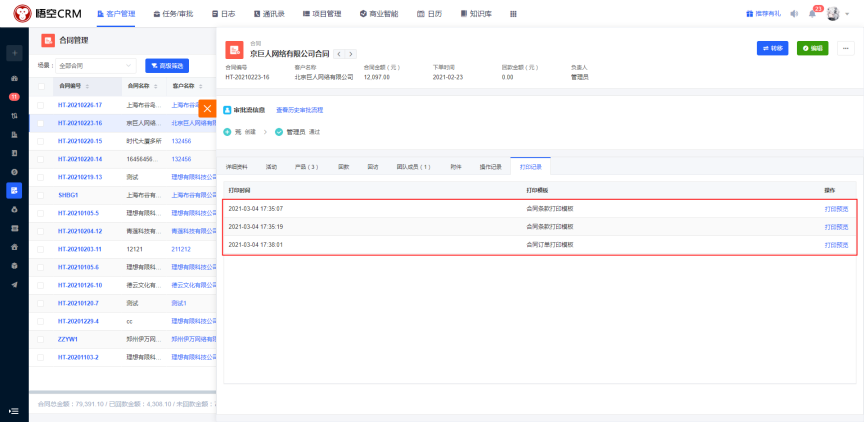 打印记录:打印记录显示的是用户打印合同模板相关操作记录,包含打印时间、模板名称;用户点击【打印预览】按钮可以查看打印合同模板的信息。