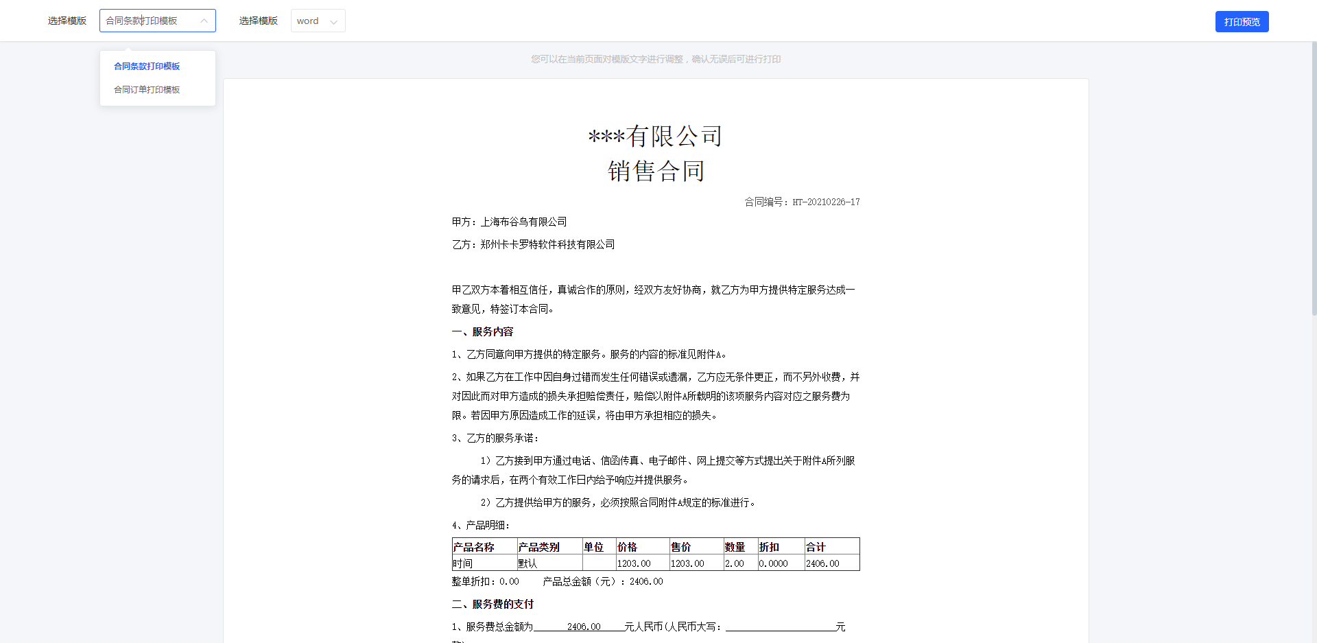 合同打印:用户需要打印合同信息时,可进入合同详情页面,在更多功能选择【打印】按钮,选择自定义合同模板、模板格式(word、pdf),点击【打印预览】跳转打印预览页面进行预览后点击【打印】按钮打印合同信息。