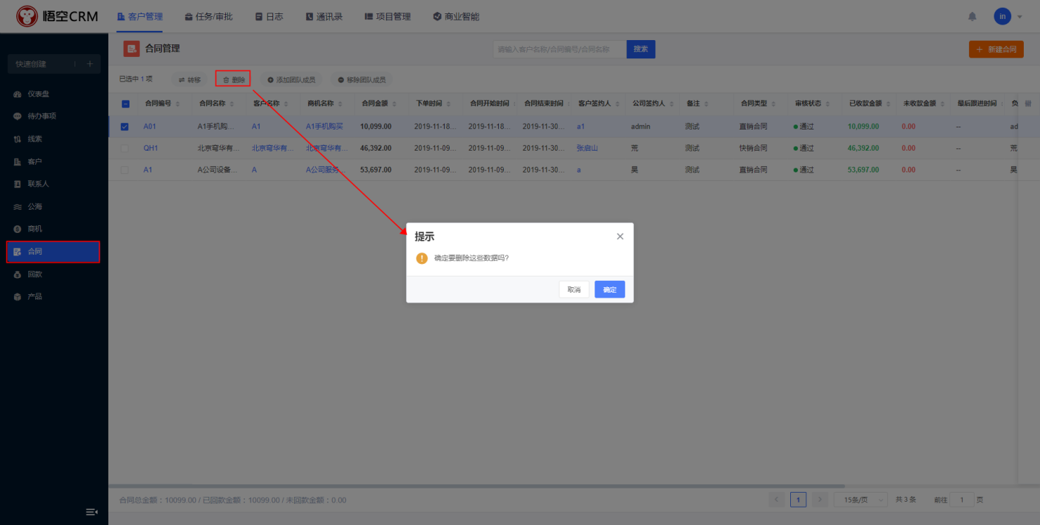 2、批量删除:选择需要删除的合同,点击【删除】则系统会删除所选合同。(删除合同注意:合同下有回款,需先删除回款)