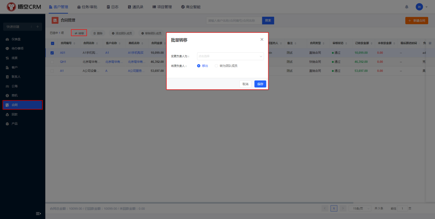 合同可以转移给其他成员进行跟进,选中一条或者多条合同数据,在导航栏处会显示「转移」按钮,点击「转移」系统会提示需要选择转移后的负责人。转移后,可将原负责人转换为团队成员(赋予只读或读写权限)和移出(原负责人不在对该合同进行维护)