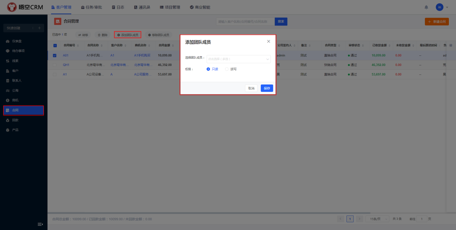 合同负责人可以将其他员工加入到合同团队中,合同团队中的成员可以共同的维护合同信息。添加团队成员可以设置团队成员的权限:只读或读写