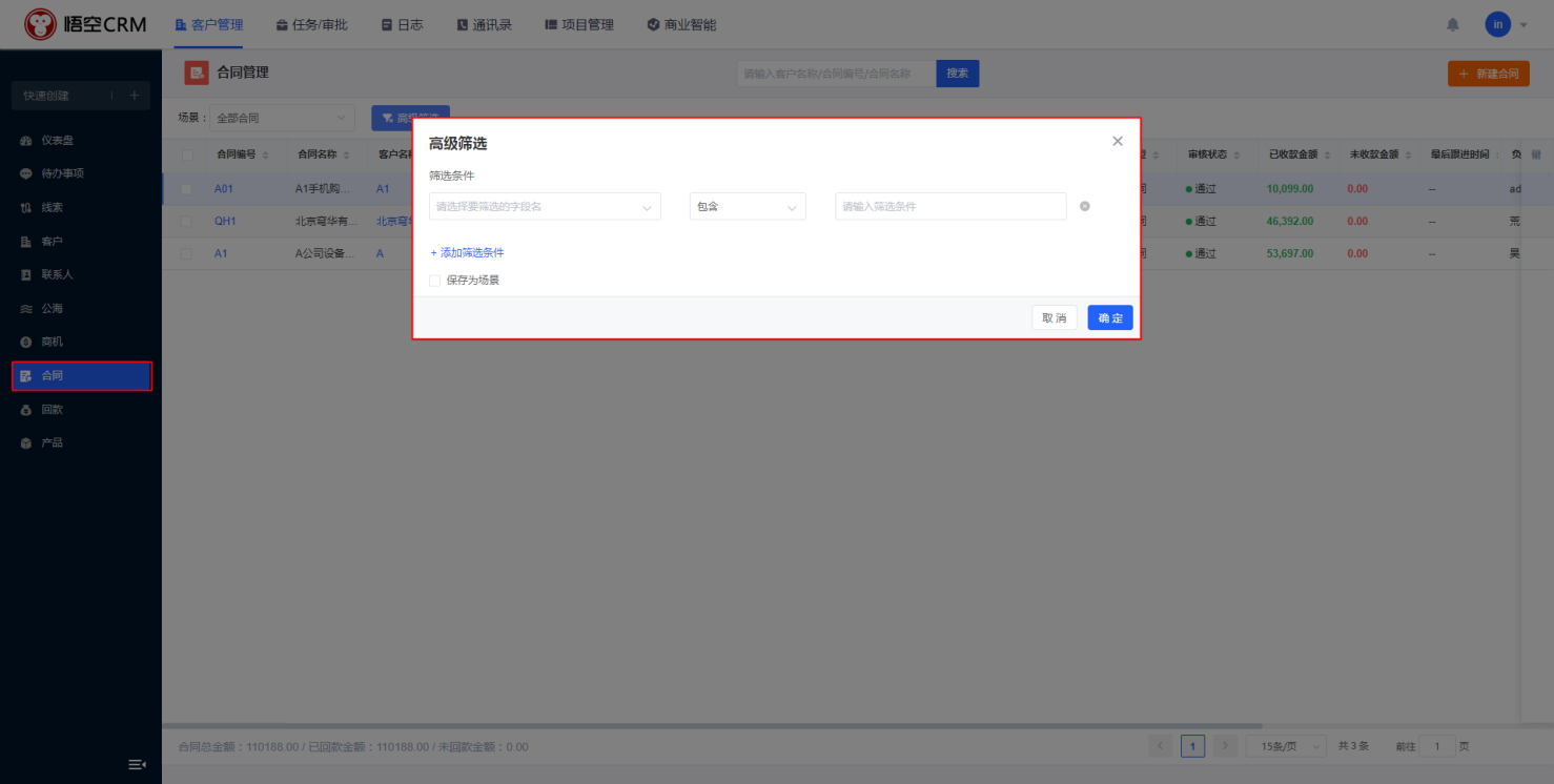 合同场景是指,用户可以将一种或多种筛选条件进行组合后,保存为一种快捷选项。用户在进行相同筛选条件进行筛选的时候,可以选择之前保存的快捷选项进行快速筛选。