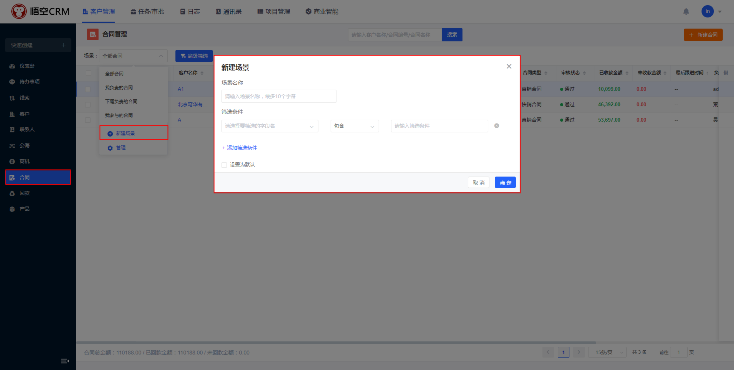 系统默认的客户场景有:我负责的合同、下属的合同、全部合同、我参与的合同。