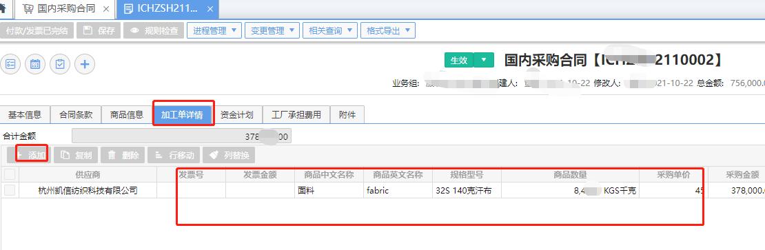 第二步:在【国内采购合同】中生成采购合同,供方填A,需方填天创。 在该单子上完善加工单信息。