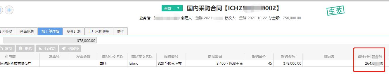 系统已控制费用付款不允许超过加工单内的金额,此外采购合同的加工单详情中的【累计已付款金额】的数据,来源于付款单-费用中的【付款用途】的“加工单费用”。 如图二的4个要素要统一。即:1)付款类型为费用,付款用途为“加工单费用”,3)付款单位与合同中的供应商一致;4)采购单号一致;一致情况下取付款单的申请金额(见图)